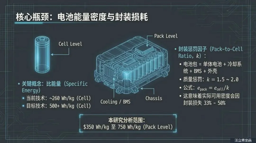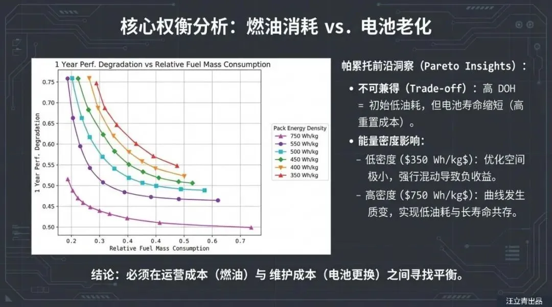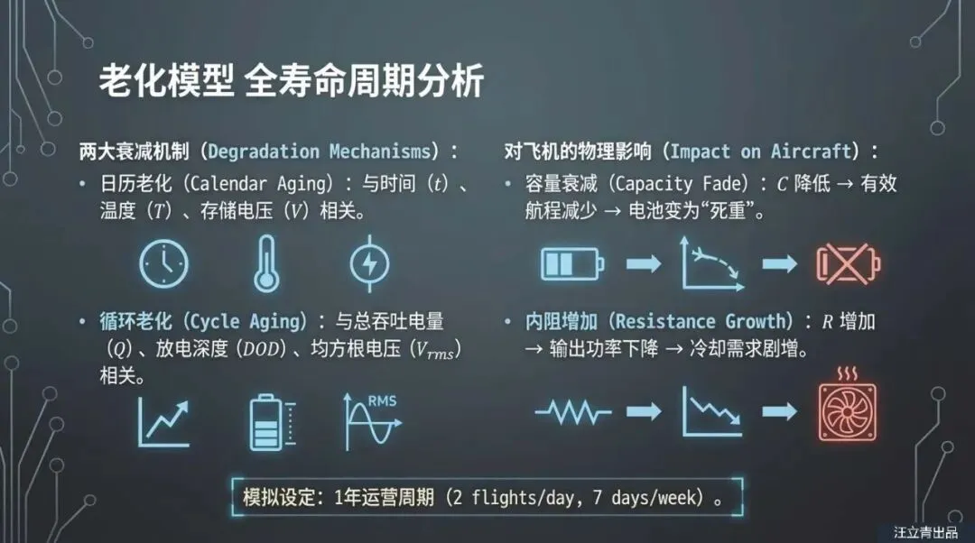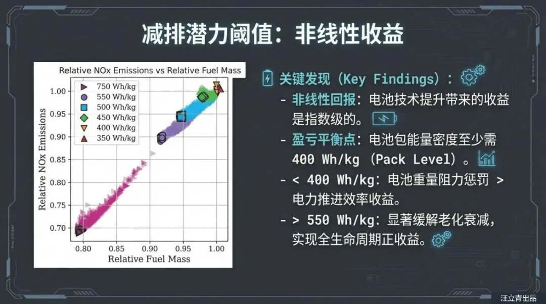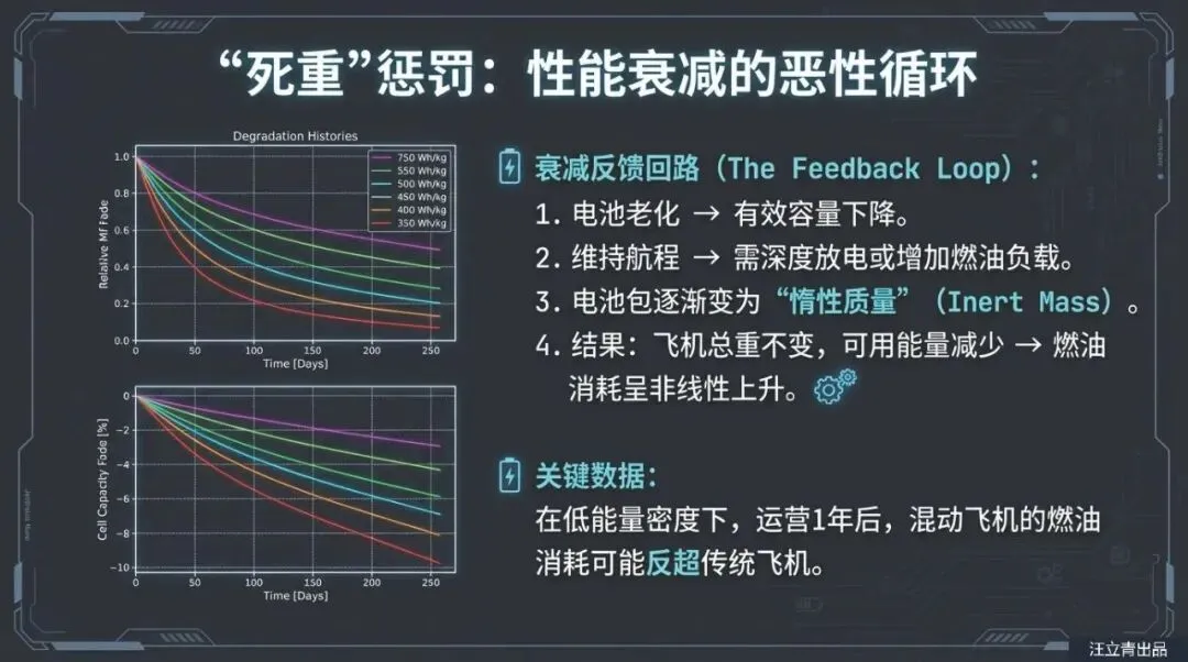让我们用通俗的逻辑来拆解这个技术难题。想象一下你的手机,刚买来时一天一充没问题,但用了一年后,电量掉得飞快。混合动力飞机面临着同样的尴尬,但后果更严重。燃油飞机是“越飞越轻”,因为油被烧掉了;但电动飞机背着几吨重的电池,不管电有没有用完,这个重量始终压在机身上,这就是所谓的“死重”。报告通过精密模型演算发现,电池的能量密度必须达到一个极高的门槛(电池包能量密度至少要超过400 Wh/kg),才能抵消掉它自身重量带来的额外油耗。更糟糕的是,随着电池老化,它的有效容量下降,内阻增加,为了维持飞行,燃气涡轮引擎不得不输出更多动力来拖着这块“日益无用”的大电池飞行,结果就是:飞了一年后,混合动力飞机的油耗甚至可能比不装电池的普通飞机还要高。