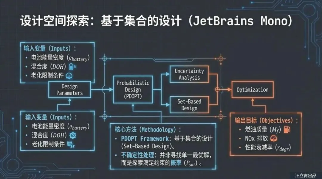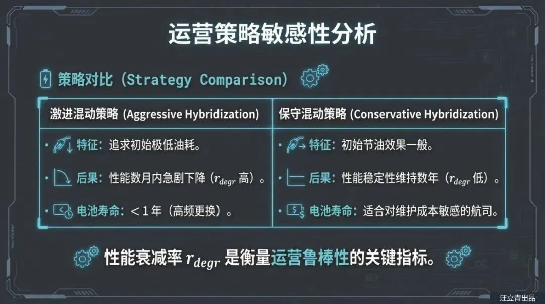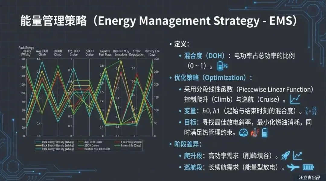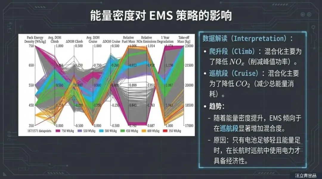 那么,我们该如何应对这种“电池焦虑”呢?研究人员利用概率设计空间探索框架(PDOPT)发现,解决之道在于“富余量”和“策略”。这就好比你买手机时特意买个超大容量的,就是为了以此抵消两年后的性能衰减。报告指出,电池能量密度越高,其抗衰减带来的负面影响能力就越强。如果电池包能量密度能达到550 Wh/kg甚至750 Wh/kg,即便电池老化,飞机依然能保持比传统燃油机更好的燃油经济性。此外,怎么用电也很讲究。虽然猛用电能瞬间减少排放,但这会加速电池老化;反之,如果为了保护电池而用得太保守,又体现不出背着大电池的价值。这需要在“省油”和“保电池寿命”之间通过精密的能量管理系统(EMS)找到一个微妙的平衡点。