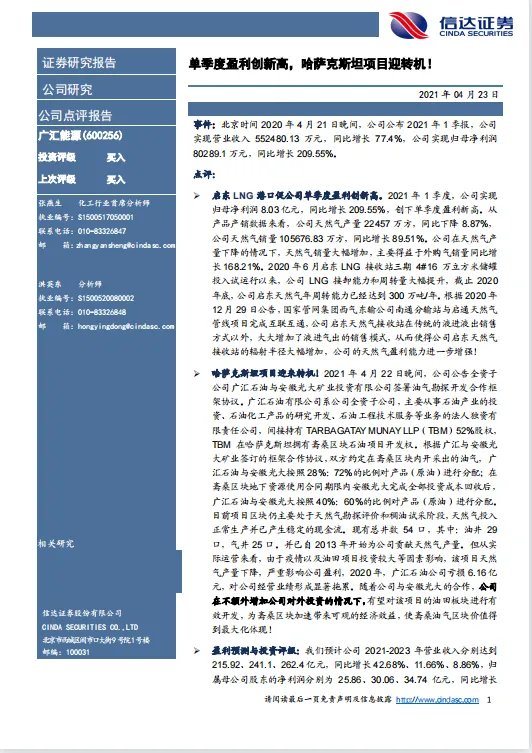 点评:➢ 启东 LNG 港口促公司单季度盈利创新高。2021 年 1 季度,公司实现归母净利润 8.03 亿元,同比增长 209.55%,创下单季度盈利新高。从产品产销数据来看,公司天然气产量 22457 万方,同比下降 8.87%,公司天然气销量 105676.83 万方,同比增长 89.51%。公司在天然气产量下降的情况下,天然气销量大幅增加,主要得益于外购气销量同比增长 168.21%。2020 年 6 月启东 LNG 接收站三期 4#16 万立方米储罐投入试运行以来,公司 LNG 接卸能力和周转量大幅提升,截止 2020年底,公司启东天然气年周转能力已经达到 300 万吨/年。根据 2020 年12 月 29 日公告,国家管网集团西气东输公司南通分输站与启通天然气管线项目完成互联互通,公司启东天然气接收站在传统的液进液出销售方式以外,大大增加了液进气出的销售模式,从而使得公司启东天然气接收站的辐射半径大幅增加,公司的天然气盈利能力进一步增强!