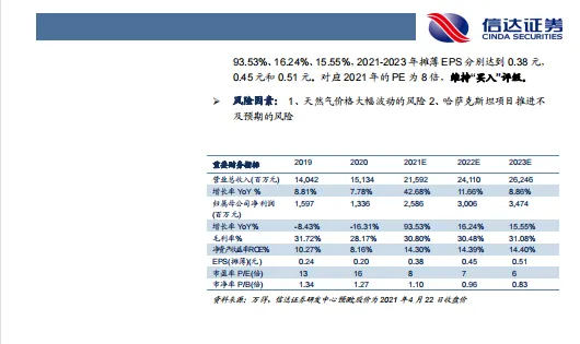 ➢ 盈利预测与投资评级:我们预计公司 2021-2023 年营业收入分别达到215.92、241.1、262.4 亿元,同比增长 42.68%、11.66%、8.86%,归属母公司股东的净利润分别为 25.86、30.06、34.74 亿元,同比增长93.53%、16.24%、15.55%,2021-2023 年摊薄 EPS 分别达到 0.38 元,0.45 元和 0.51 元。对应 2021 年的 PE 为 8 倍,维持“买入”评级。