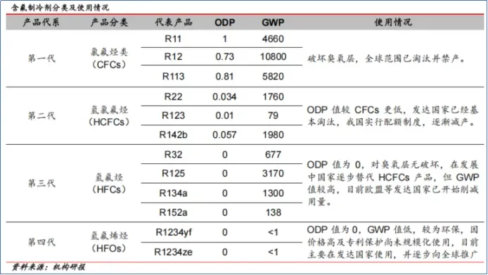 根据ODP值(消耗臭氧潜能值)和GWP值(全球升温潜能值)进行环保程度评估,氟制冷剂经历了四代迭代。