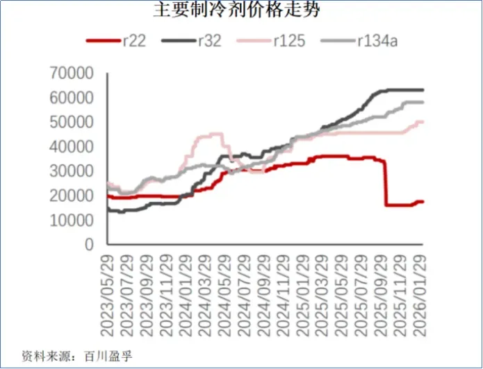 截至2026年1月末,R32、R125、R134a等三代制冷剂的市场报价分别上升至63000元/吨、51000元/吨、57000元/吨左右。