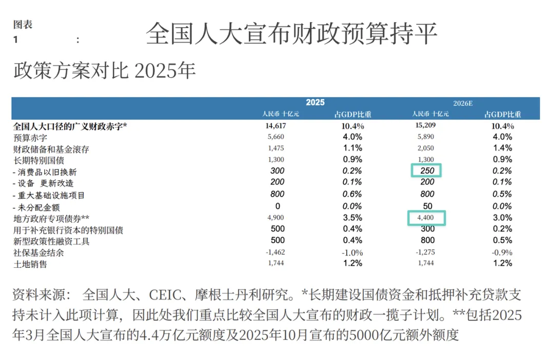 增长目标下调至4.5‑5.0%(彭博共识4.6%),财政赤字收窄50个基点(初步估计),释放门槛降低信号。是为缓冲,而非提振。工作报告特别指出,务实的经济目标将为结构性调整、风险防范和改革留出空间这与我们的观点一致,即这降低了仅为实现年度目标而依赖投资主导工具的压力。科技升级是核心,基建作为缓冲,消费和社会福利支持则有针对性且力度适中工作报告承诺科技支出将继续快速增长(~10%Y),强调新兴和未来产业。另一方面,对消费的直接支持,以及社会福利方面的增量追加支出(农村养老金和医疗保险补贴),均与2025年持平或略低。若经济增长触及目标区间下限(4.5%附近),下半年可能追加约0.5% GDP的财政补充,包括可能的服务消费支持。与“十四五”规划类似,北京未设定五年 GDP增长目标,但将提供民生、科技及绿色转型领域的数字目标。尽管政策制定者重申了提高消费占GDP比重的雄心,但目前尚不清楚是否会提供一个量化目标。在我们看来,明确的目标将有助于加强市场对北京致力于中期经济再平衡的信心预算赤字率4%维持不变,减少地方债发行额度,财政储备结转规模略有扩大。尽管地方专项债额度比2025年降低了5000亿,但缺口通过增加zf性基金转移支付及地方财政结转资金(增加5750亿)得以填补。准财政支出也增加了3000亿,以支持重大基建项目。扩大的财政赤字大部分聚焦于资本支出,重点在科技、城市更新及绿色转型领域民生领域预算支出略有增加,而对以旧换新项目的支持则有所减少预算内支出实现 4.4%的同比增长,其中超 50%的增量资金投向社会福利与消费相关领域消费品以旧换新资金从3000亿降至2500亿,设备升级维持2000亿元不变,民生支出仅小幅增加。新增1000亿专项资金,用于对中小企业、设备升级和消费的利息补贴