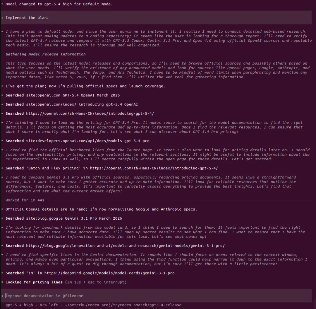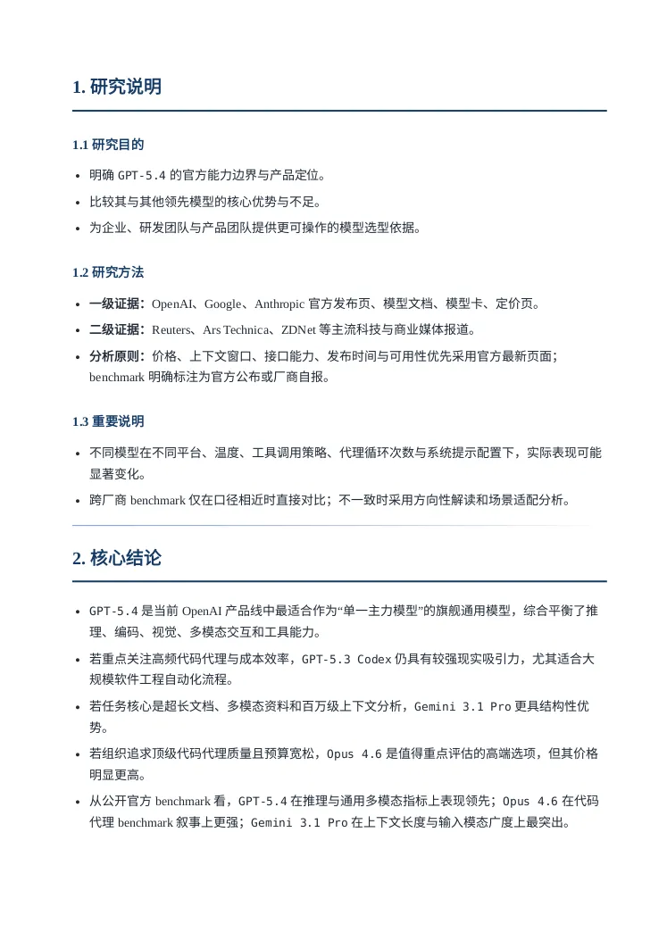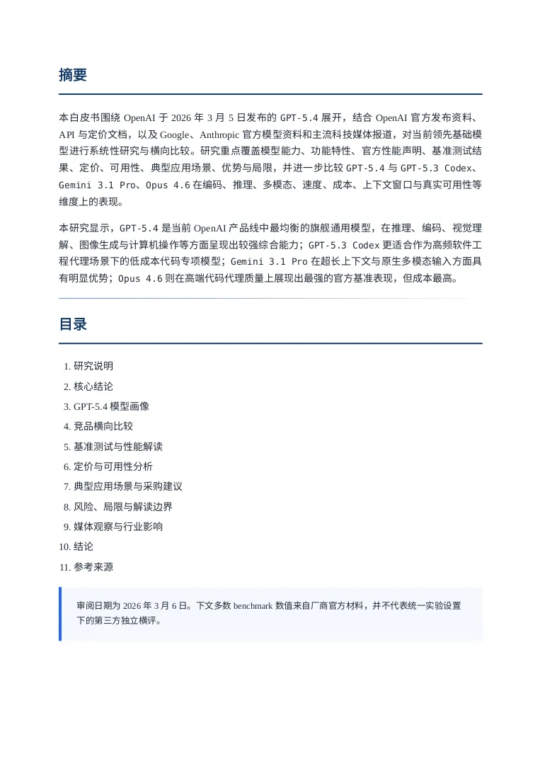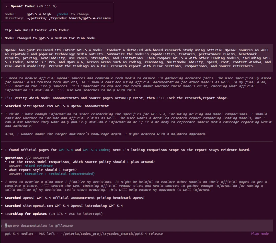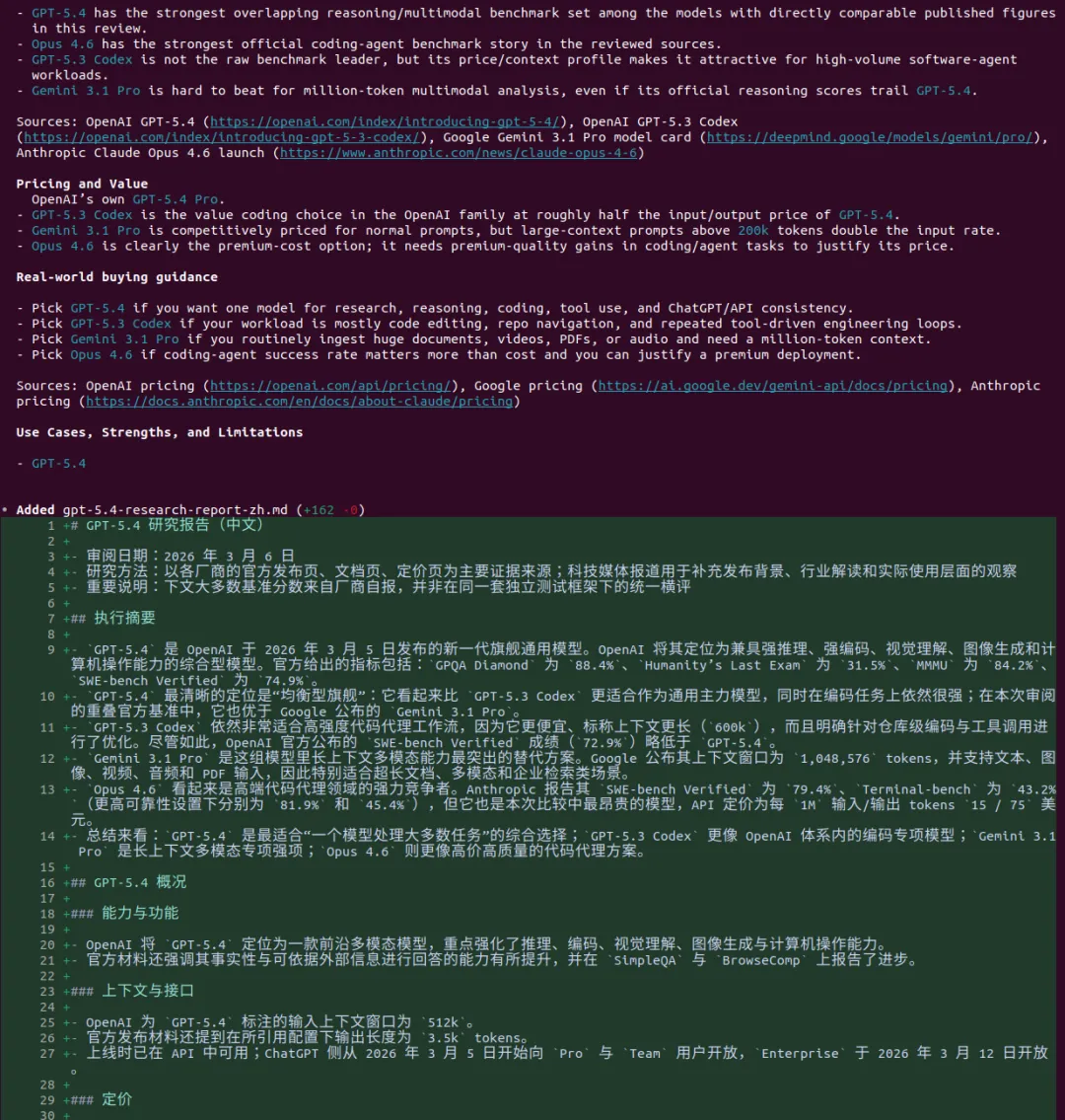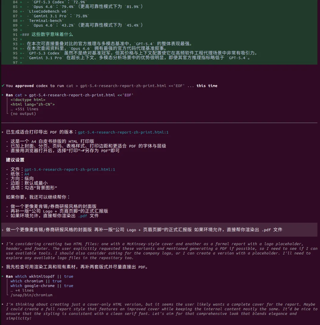 引言听说OPENAI最近人才回流很凶,一副要搞大事情的样子,这不GPT5.4模型这么快就发布了,这回必须说“OPENAI YES!”。那咱今天就用用试试吧,用它干个啥呢?就写一个GPT5.4模型的研究报告吧。话不多说直接上干货,文末会附上报告制作过程。研报pdf截图报告制作过程我使用了codex cli加载了最新的GPT5.4模型,在plan模式输入如下提示词:OpenAI has just released its latest GPT-5.4 model. Conduct a detailed web-based research study using official OpenAI sources as well as reputable and popular technology media outlets. Summarize the model’s capabilities, features, performance claims, benchmark results, pricing, availability, use cases, strengths, and limitations. Then compare GPT-5.4 with other leading models, including GPT-5.3 Codex, Gemini 3.1 Pro, and Opus 4.6, across areas such as coding, reasoning, multimodal ability, speed, cost, context window, and real-world usability. Present the findings as a full research report with clear sections, comparisons, and source references.对gpt5.4生成的计划满意后开始撰写,期间会调用工具检索最新信息放入它的上下文中。生成的内容被我要求翻译为中文并保存为markdown文件。codex cli 和gpt5.4很会循循善诱,干完活还会抛出几个进一步的选项。引导我输出券商研报的样式,它采用的技术方案是先生成网页版再打印成pdf发布版本。最后贴上软件版本和token消耗情况: