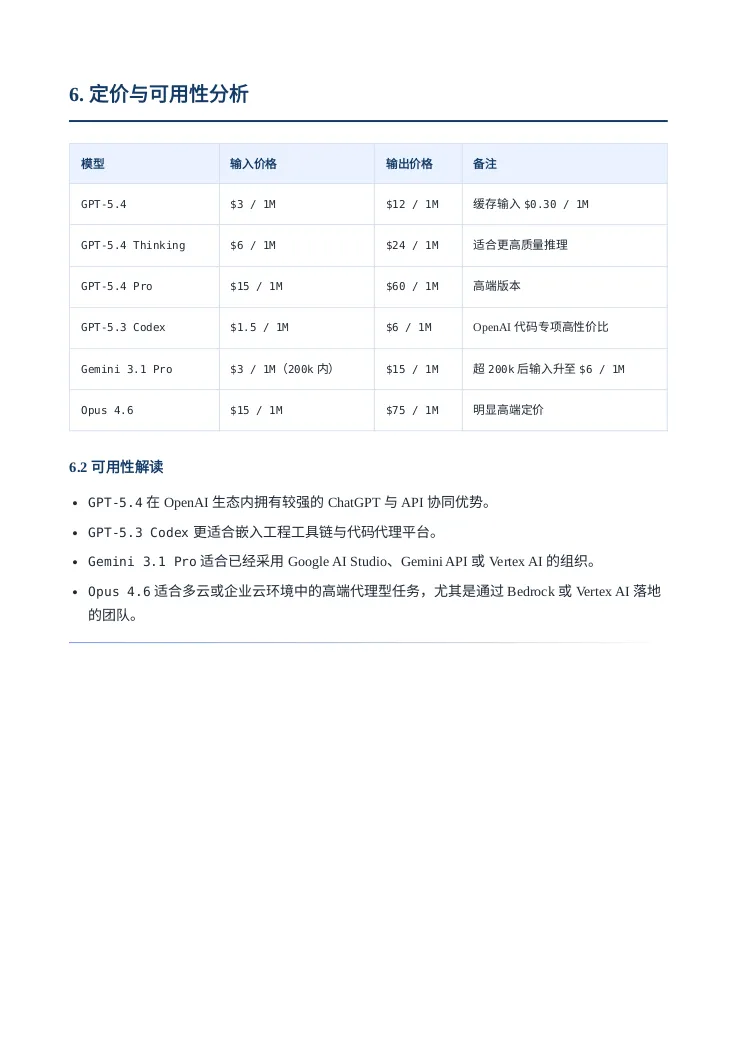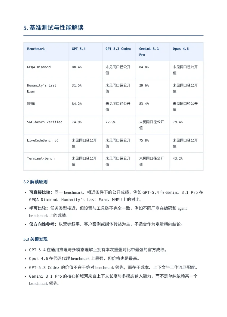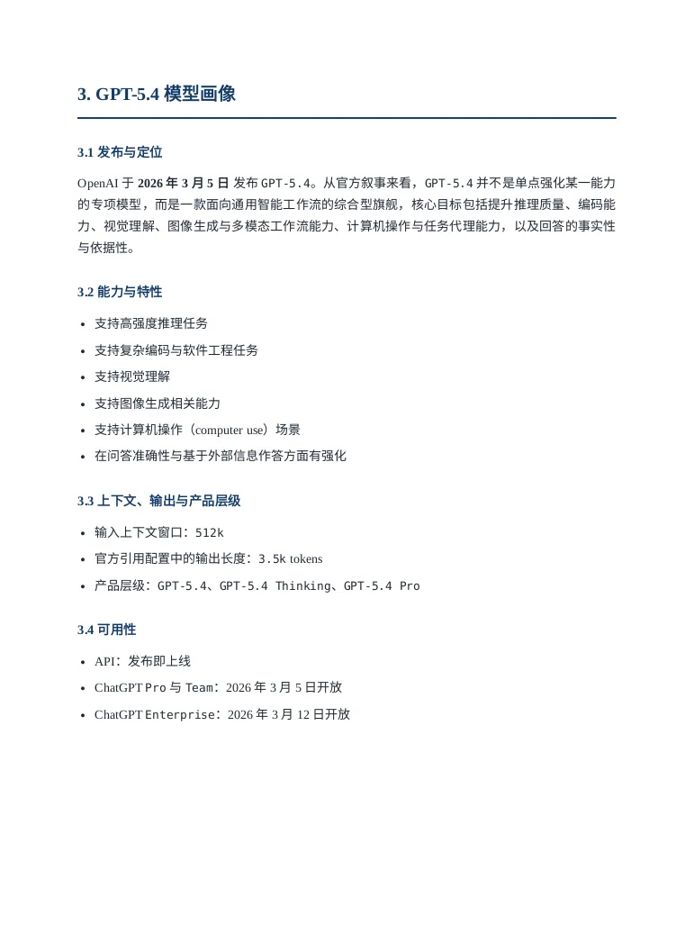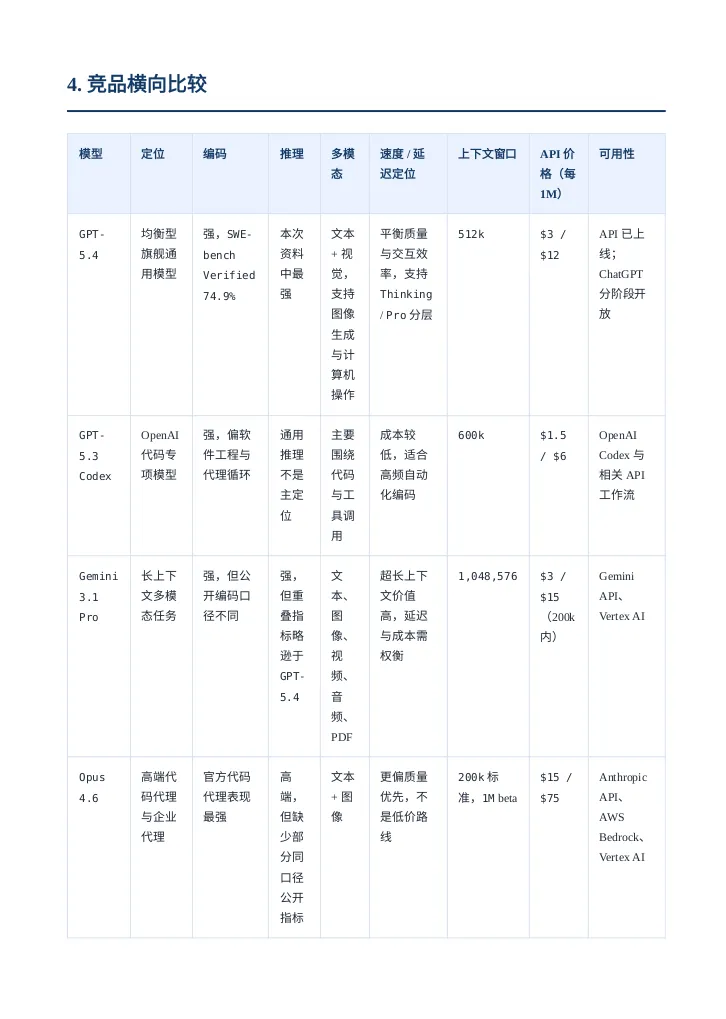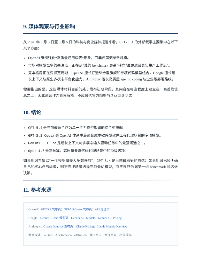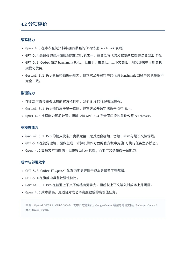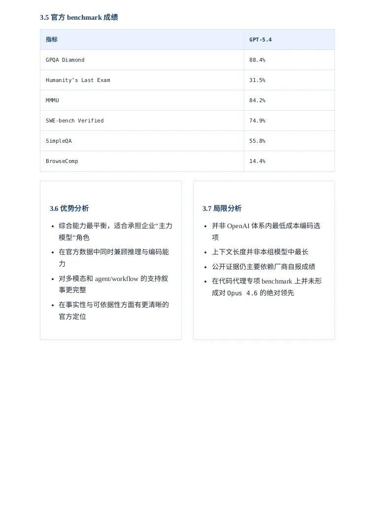 引言听说OPENAI最近人才回流很凶,一副要搞大事情的样子,这不GPT5.4模型这么快就发布了,这回必须说“OPENAI YES!”。那咱今天就用用试试吧,用它干个啥呢?就写一个GPT5.4模型的研究报告吧。话不多说直接上干货,文末会附上报告制作过程。研报pdf截图报告制作过程我使用了codex cli加载了最新的GPT5.4模型,在plan模式输入如下提示词:OpenAI has just released its latest GPT-5.4 model. Conduct a detailed web-based research study using official OpenAI sources as well as reputable and popular technology media outlets. Summarize the model’s capabilities, features, performance claims, benchmark results, pricing, availability, use cases, strengths, and limitations. Then compare GPT-5.4 with other leading models, including GPT-5.3 Codex, Gemini 3.1 Pro, and Opus 4.6, across areas such as coding, reasoning, multimodal ability, speed, cost, context window, and real-world usability. Present the findings as a full research report with clear sections, comparisons, and source references.对gpt5.4生成的计划满意后开始撰写,期间会调用工具检索最新信息放入它的上下文中。生成的内容被我要求翻译为中文并保存为markdown文件。codex cli 和gpt5.4很会循循善诱,干完活还会抛出几个进一步的选项。引导我输出券商研报的样式,它采用的技术方案是先生成网页版再打印成pdf发布版本。最后贴上软件版本和token消耗情况: