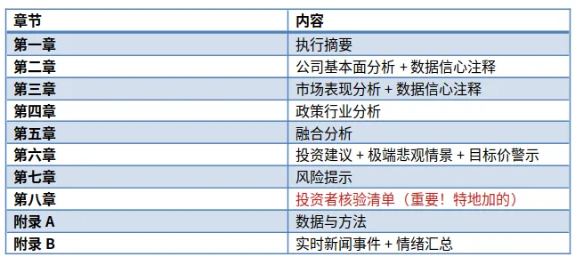 封面 → 执行摘要 → 公司基本面 → 市场分析 → 政策行业 → 融合分析 → 投资建议 → 风险提示 +附录