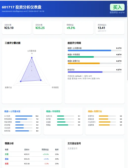 三维雷达图(Chart.js)+评分条 + 组件卡片+ 情景分析表 +交叉验证信号