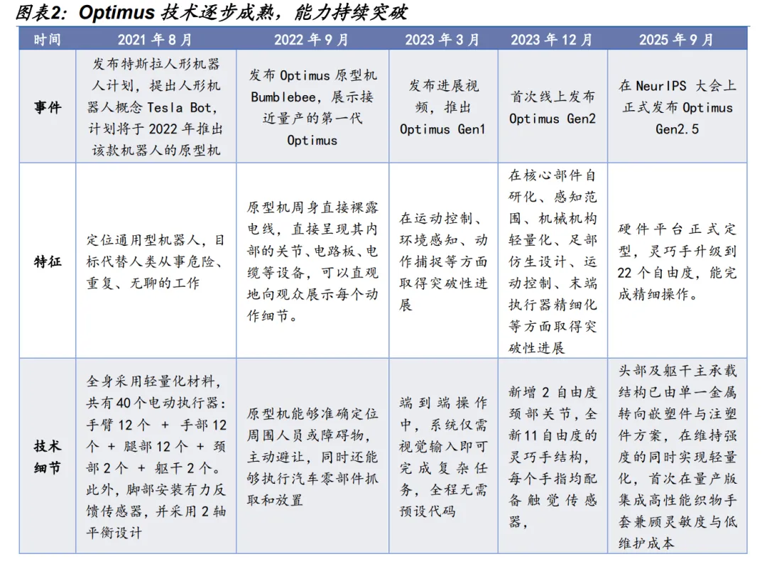2、25年9月,特斯拉发布Gen2.5版本及其定型设计,进一步升级了灵巧手、运动性能及AI架构;同年Optimus顺利进入试生产阶段,特斯拉同步启动了弗里蒙特工厂试点产线的建设工作。