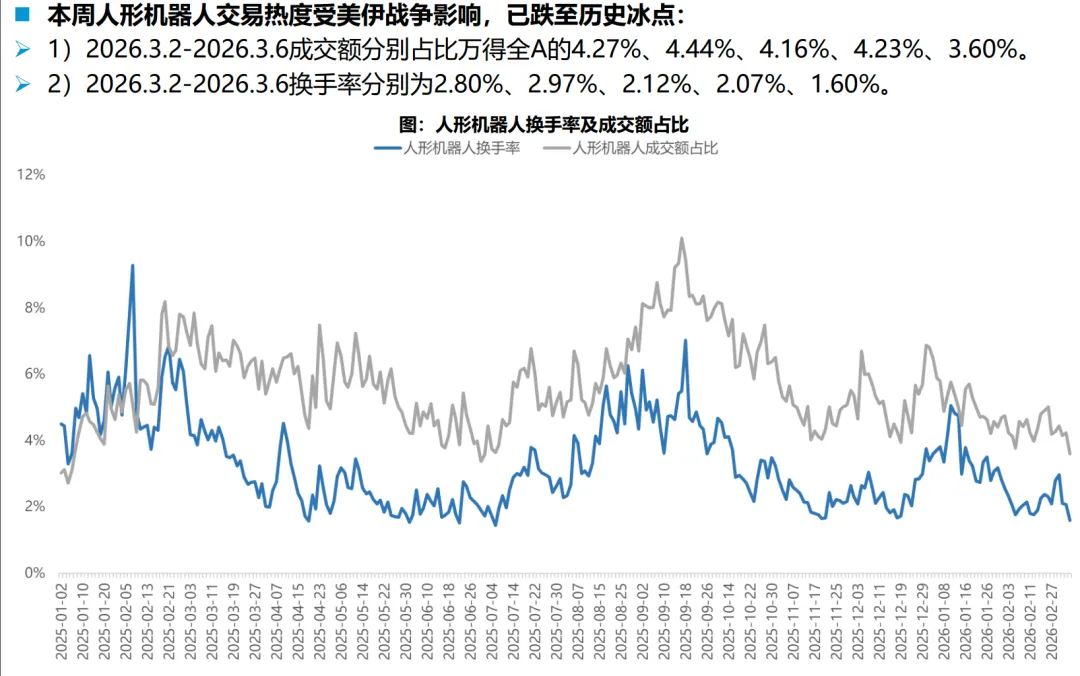 核心结论:目前机器人交易热度已跌至历史冰点,成交额和换手率均处于历史低位,在Optimus Gen3即将发布的关键时刻,建议逢低优先布局T链,调整到底终有反弹,若实际发布效果超预期将带来板块性贝塔机会。