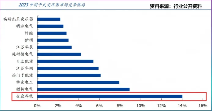 路径分野下,金盘科技稳坐我国干式变压器头把交椅,2023年金盘科技干式变压器以14%的市占率,位居第一。