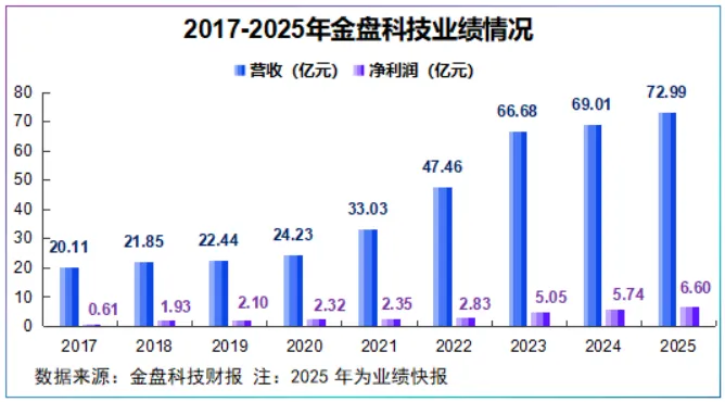 公司营收从2017年的20.11亿元跃升至2025年的72.99亿元,净利润从0.61亿元跃升到6.6亿元,年均复合增速分别达17.48%、43.67%。