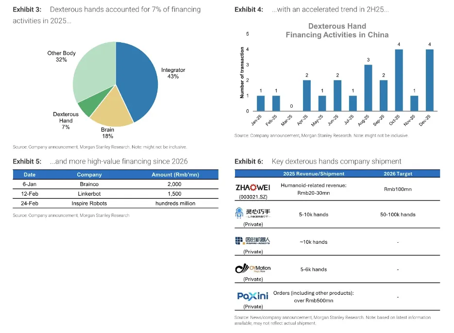 2025 年灵巧手领域融资占机器人整体融资的 7%,且下半年融资节奏明显加快;2026 年仅 1-2 月,该领域融资规模就接近 40 亿元,Brainco、Linkerbot、Inspire Robots 等头部企业先后获得大额融资(Brainco: 20亿元 Linkerbot: 15亿元 Inspire Robots: 数亿元),资本的持续加码为技术迭代、产能扩张提供了充足的资金支持。