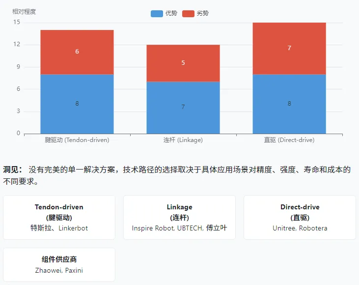 腱驱式:高自由度、高灵巧性、手指轻量化,特斯拉 Optimus 最新款灵巧手即采用该方案,但存在有效载荷低、线缆易磨损、寿命短的问题,适配高精度操作场景; 连杆式:强度高、耐用性好、成本更低,是目前性价比最优解,但手指运动灵活性不足,适配工业场景、成本敏感型部署; 直驱式:每个关节配备紧凑型执行器,关节控制精准独立、动作响应快,但重量和发热问题突出,成本也更高,适配工业场景和数据采集环节。