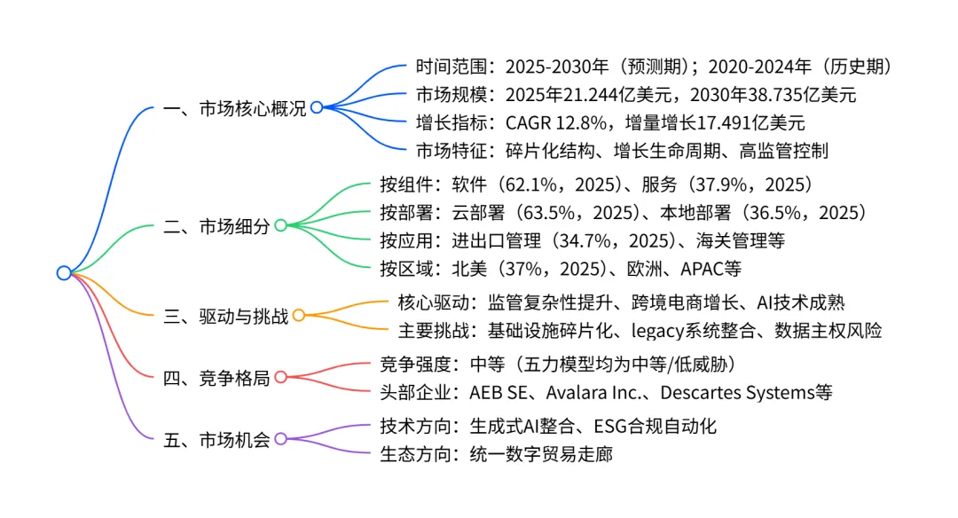 2025-2030年全球跨境贸易合规自动化市场呈现加速增长态势,2025年市场规模达21.244亿美元,2030年将增至38.735亿美元,CAGR 为 12.8%,增量增长17.491亿美元;市场结构呈碎片化特征,北美为最大区域市场(2025 年占比 37%),APAC为增长最快区域(CAGR 13.5%);软件(CAGR 13.4%)和云部署(CAGR 14.3%)是增速最快的细分领域,进出口管理为最大应用场景(2025 年占比 34.7%);核心驱动因素包括监管复杂性提升、跨境电商扩张及 AI 技术成熟,主要挑战为数字基础设施碎片化、 legacy 系统整合障碍及数据主权风险,市场竞争格局以中等竞争强度为主,头部企业包括 AEB SE、Avalara Inc. 等。