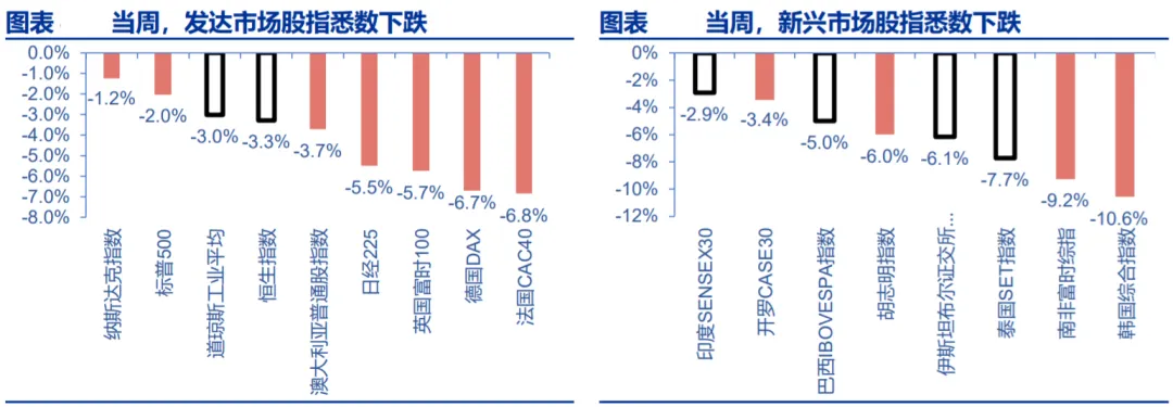 大类资产:地缘摩擦升温,油价飞速上涨 当周,发达市场股指悉数下跌、新兴市场股指悉数下跌。发达市场股指方面,法 国 CAC40、德国 DAX、英国富时 100 分别下跌 6.8%、6.7%、5.7%;新兴市场股指 方面,韩国综合指数、南非富时综指、泰国 SET 指数分别下跌 10.6%、9.2%、7.7%。