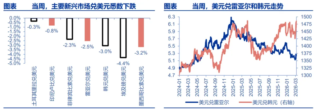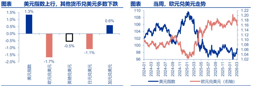 当周,美元指数上行,其他货币兑美元多数下跌。美元指数上涨 1.3%至 98.96, 欧元兑美元贬值 1.7%,英镑兑美元贬值 0.5%,加元兑美元升值 0.6%,日元兑美元贬 值 1.1%。主要新兴市场货币兑美元悉数下跌,巴西雷亚尔兑美元贬值 2.5%,菲律宾 比索兑美元贬值 2.3%,韩元兑美元贬值 3.0%,印尼卢比兑美元贬值 0.8%,埃及镑兑 美元贬值 4.4%,墨西哥比索兑美元贬值 3.2%,土耳其里拉兑美元贬值 0.3%。