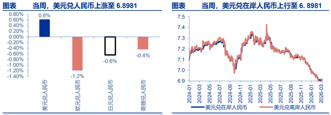 当周,人民币兑美元贬值。美元兑在岸、离岸人民币汇率分别变动至 6.8981 和 6.9093,日元兑人民币贬值 0.6%,英镑兑人民币贬值 0.4%,欧元兑人民币贬值 1.2%。