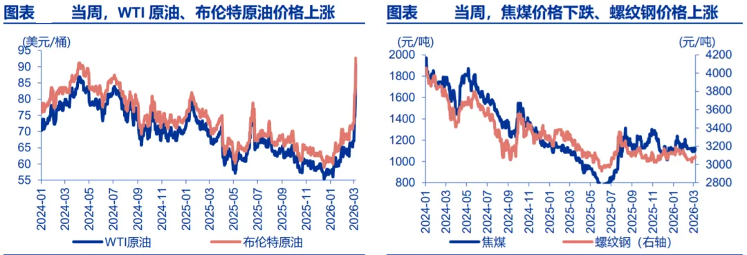 当周,大宗商品价格多数上涨。布伦特原油价格上涨 27.9%至 92.7 美元/桶,WTI 原油价格上涨 35.6%至 90.9 美元/桶,LME 镍价格下跌 2.8%至 17380 美元/吨,玻璃 价格上涨 2.4%至 1087 元/吨,生猪价格下跌 2.8%至 11160 元/吨。