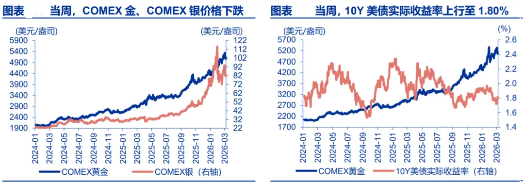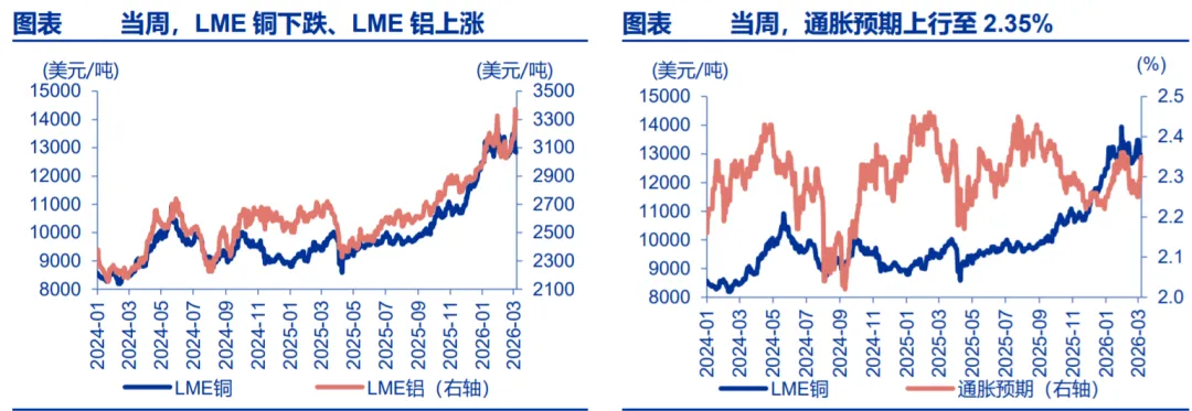 当周,有色金属价格多数下跌、贵金属价格悉数下跌。LME 铝上涨 6.2%至 3360 美元/吨,LME 铜下跌 4.8%至 12840 美元/吨;通胀预期上行 10bp 至 2.35%;COMEX 银价格下跌 11.0%至 83.5 美元/盎司,COMEX 金价格下跌 2.7%至 5137.5 美元/盎司; 10Y 美债实际收益率上行 8bp 至 1.80%。