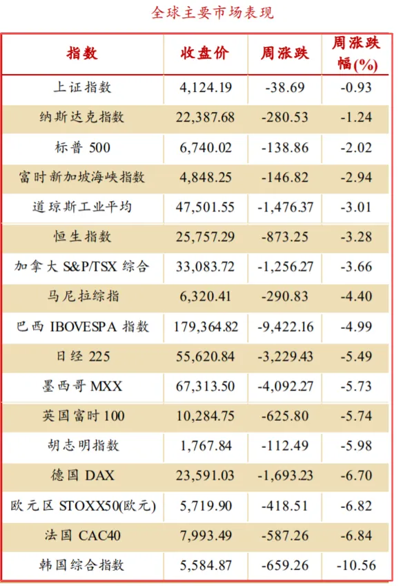 本周多 数拉美、东南亚等新兴市场出现明显回调。由于经济景气度或 美国外交、关税和贸易政策不确定性等多重因素影响,预计阿 根廷 MERVAL、巴西 IBOVESPA、印度 SENSEX30 等拉美、东 南亚等海外新兴市场指数即使未来短期超跌反弹,中期容易出 现震荡。