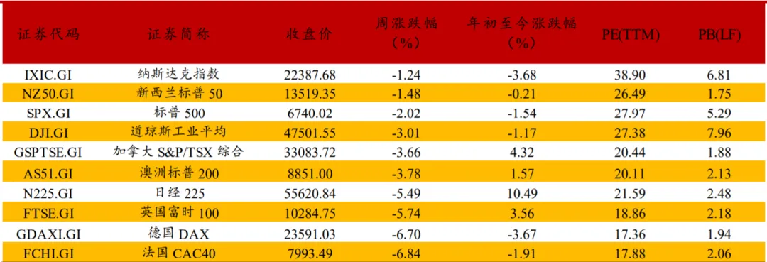 由于中东地缘问题加剧,本周全球多 数市场出现了明显回调;另一方面,中东地缘问题只是触发近 期全球多数市场回调的导火索而非根本因素,估值、股价偏离 基本面、获利盘兑现收益、特朗普时期的政策等等因素对于很 多市场影响更加关键。