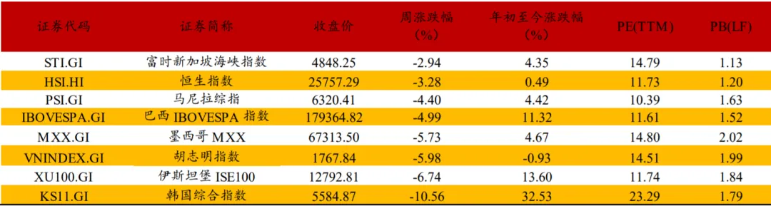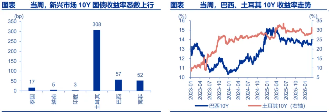 当周,新兴市场 10 年期国债收益率悉数上行。土耳其上行 307.5bp 至 31.28%, 巴西上行 56.8bp 至 14.00%,印度上行 2.7bp 至 6.69%,越南上行 5.4bp 至 4.31%, 南非上行 52.0bp 至 8.49%,泰国上行 16.9bp 至 1.89%。本周韩国市场出现大幅回落,由于科技类资产仍然存 在较多泡沫且压力没有消化充分,即使未来短期超跌反弹,韩 国综合指数中期仍然存在调整压力。本周多数中东指数出现大 幅下跌,由于中东地缘问题较为复杂,预计现阶段容易波动偏 多。