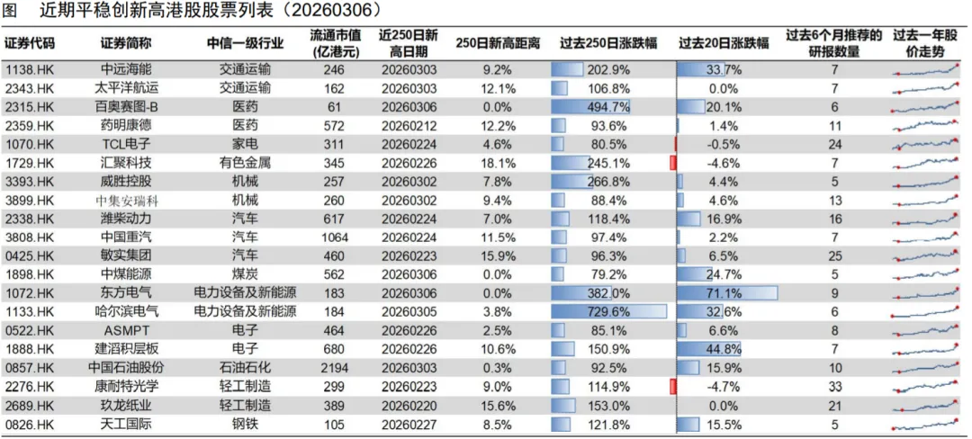 我们根据分析师关注度、股价相对强弱、股价路径平稳性、创新高连续性等 角度在过去 20 个交易日创出过 250 日新高的股票池中筛选出平稳创新高股 票。 近期,中国石油股份等股票平稳创出新高。