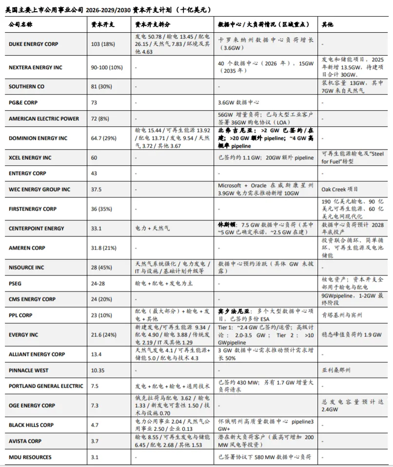 公司目前推出了四个 behind-the-meter 项目(Socrates、Apollo、Aquila、Socrates), 装机容量 340-550MW,主要采用中小型燃气轮机(辅以部分往复式发动机及储能)发 电,Socrates 作为概念验证项目完全按时按预算推进,数月内即可通气调试。在增长 与回报方面,电力项目均为 5x multiple(预计在 20%+),与传输扩建项目(约 6 倍) 回报相当。当前已宣布的四个电力项目及传输项目已锁定 8%增长,至 2030 年 10%+增 长只需从 backlog 再推进若干项目即可轻松实现。宏观层面,美国天然气需求 10 年增 长 50%,基础设施仅增长不到 30%,严重短缺。公司通过 Transco 等核心管道扩建、 营销臂供气,以及 behind-the-meter 发电专长,在基础设施和数据中心电力领域均有 巨大增长空间。我们看好公司在原有业务基础上的转型,美国数据中心需要灵活及快 速上线的电力基础设施。