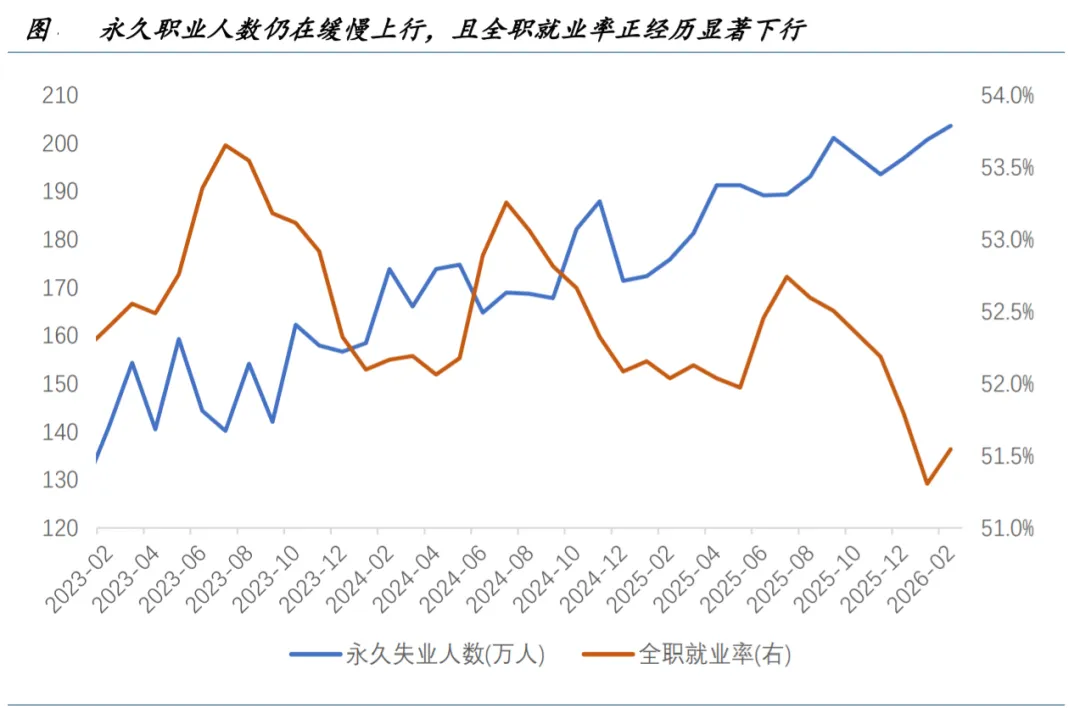 考虑到“出生-死亡模型”的波动,以及凯撒医疗集团 3.1 万员工罢工影响,1-2 月的医疗保健业的月均新增就业仍保 持在 4.8 万人(25 年均值 5.7 万人)不可谓不强;但其余私人部门就业仍相当疲软,且负增长居多。与此同时,永久失 业人数仍在持续而缓慢的上升,全职就业率在过去数月中的下降幅度亦超过了以往的季节性趋势,都是恶化的信号。