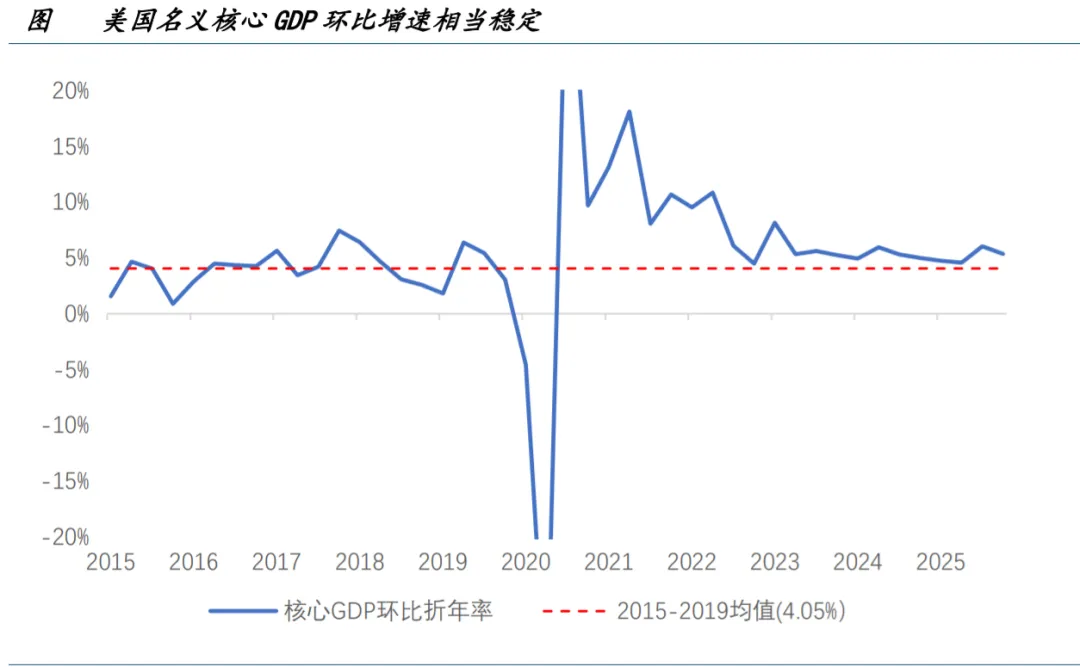 我们理解在美国经济中实体资产与 AI 资产是一个“伴生”关系,甚至在过去两年是一个“从属”关系:无 AI,不增 长。我们通过对美国名义 GDP 的逐步拆解来做出论证,首先从 GDP 中拆除库存、政府支出和净出口这些波动极大的 “非核心”部分,可以发现其余的核心 GDP 部分(消费+固定资产投资)在过去两年表现相当稳定。
