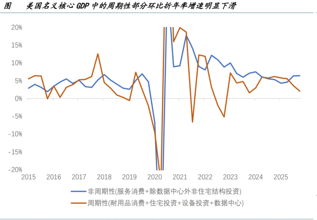 进一步的,如果我们把核心部分拆分为顺周期(耐用品消费+住宅投资+设备投资+数据中心)与非顺周期(服务消费+ 除数据中心外非住宅结构投资)部分,可以发现周期性部分的名义 GDP 环比折年率增速出现明显回落,非顺周期部分 依然相对稳健。在联储降息的背景下,这种增速的劈叉亦说明货币政策效用的下降,即利率敏感型部门变得“不敏感”。