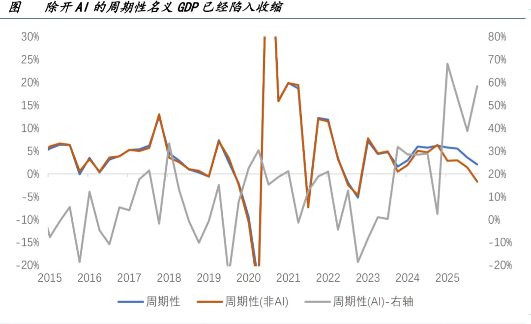 对于美国经济而言,占整体名义 GDP 16.5%的周期性经济部分才是政策的作用目标;但如果我们把占名义 GDP 1%的 AI 部分拿掉,剩下那 15.5%对应着实体的周期性经济部分自 2022 年第四季度以来再次环比(折年率)收缩。而 2015- 2019 年期间,唯一的环比负增长发生在 2019 年第一季度——随后便是联储连续三次 25bp 降息。