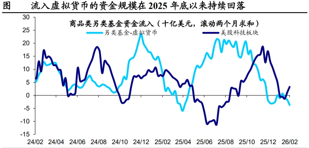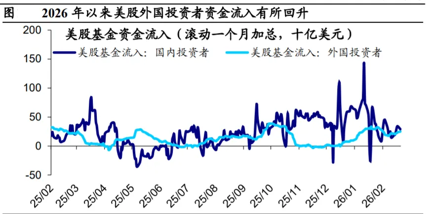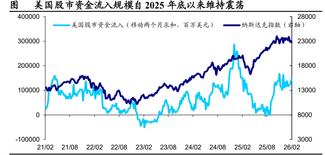 2026 年以来,美股资金流入的边际增量趋弱。2023-2024 年,ChatGPT 引发 的生成式 AI 浪潮为美国科技板块注入超额溢价,叠加美国经济展现出的韧 性,美股成为了全球增量资金流入的最主要目的地。不过,2026 年以来, 美股资金虽然维持正向流入,边际增量已略显不足。