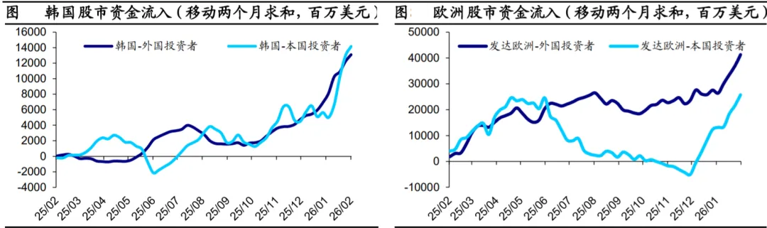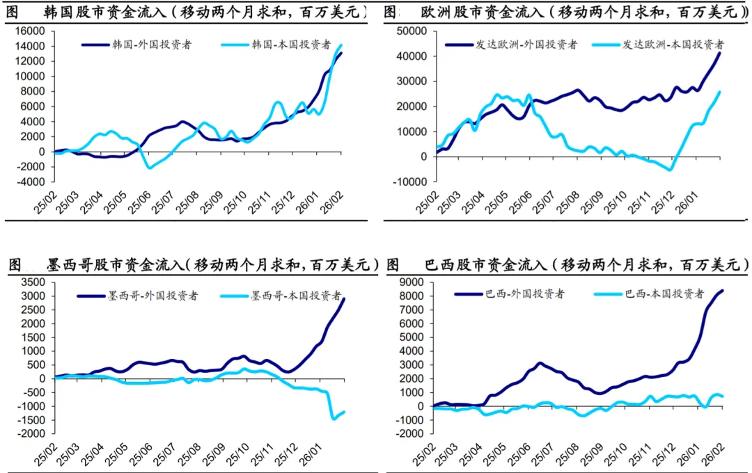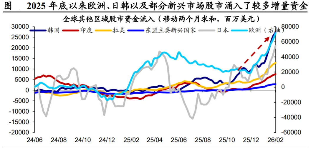 与此同时,2025 年底以来,欧洲、日韩、拉美、印度以及其他部分新兴市 场资金呈加速流入趋势。资金流动向资源、科技、制造等“硬核”供应链领 域加速集中,呈现全球再平衡的特征。