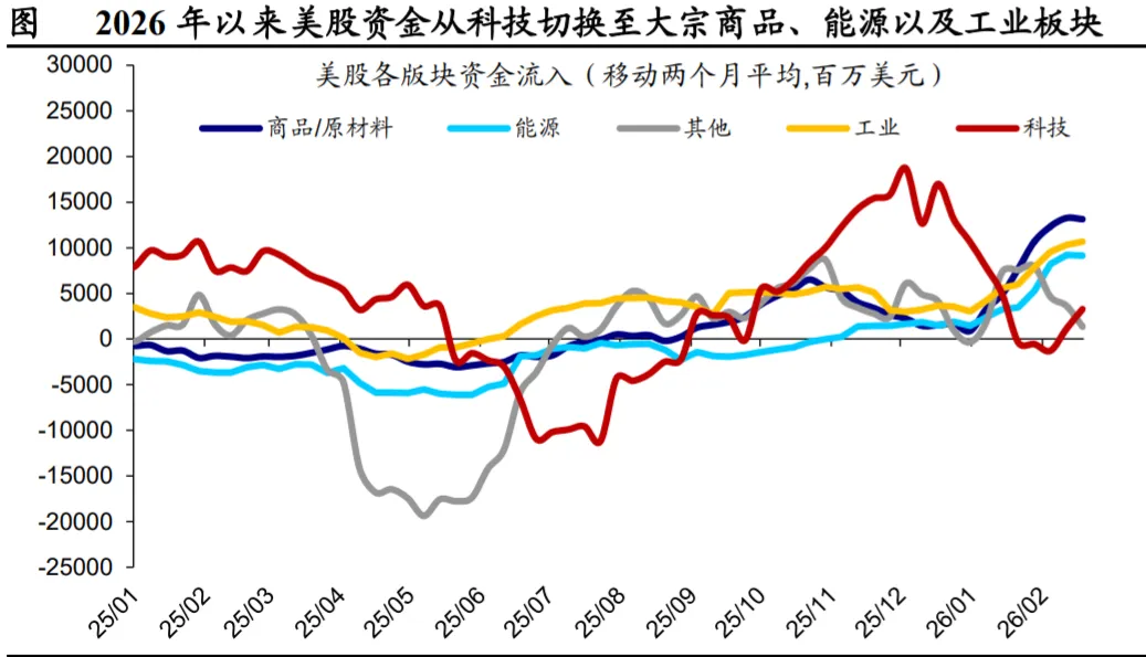 2026 年以来,欧洲、日 韩、拉美、印度以及其他部分新兴市场资金呈加速流入趋势,资金 流动向资源、科技、制造密集型领域集中,呈现全球再平衡的特征。 除了美国与非美市场之间的再平衡外,美股内部也呈现出从科技向 大宗商品、能源以及工业板块的轮动。在 AI 技术进步、地缘政治格 局变化以及产业链重构的背景下,市场开始重新关注能够跨越技术 周期的有形生产性资产,资金开始向重资产与上游行业进行倾斜。