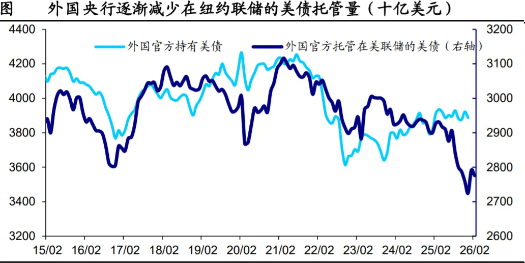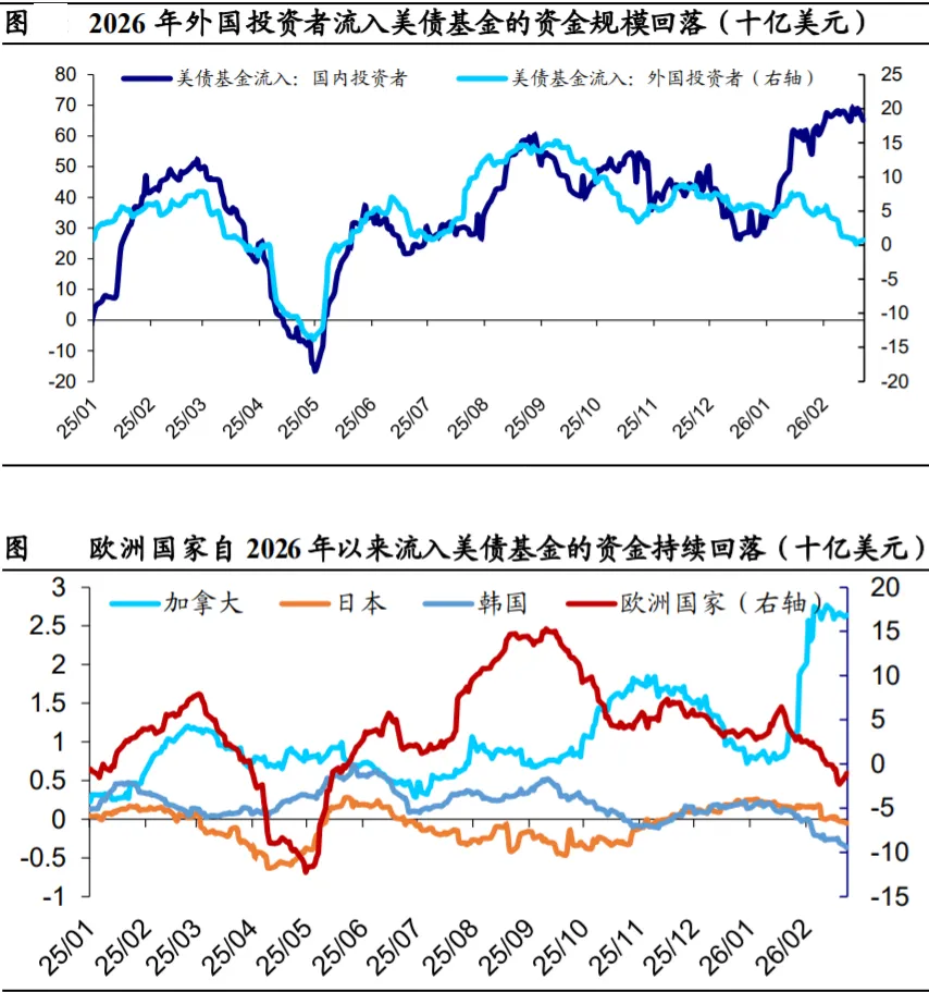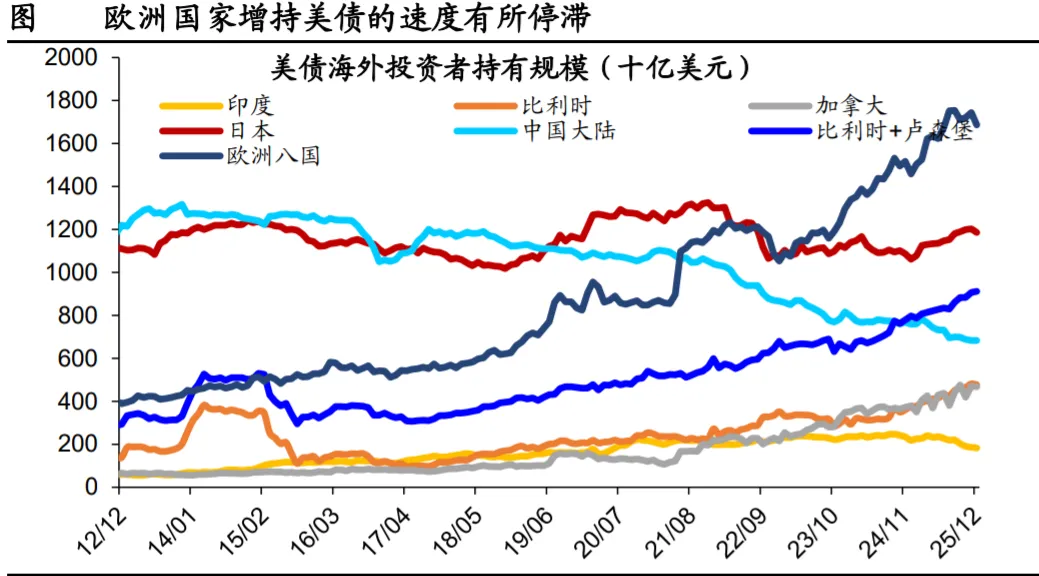 美债方面,外国官方部门尚未出现明显 减持美债的迹象,但开始降低在美联储的美债托管规模。分国家来 看,截至 2025 年 12 月,欧洲和日本国家增持美债趋势有所停滞, 比利时与卢森堡持有美债的规模上升,但这可能受到部分国家将原 先在纽约联储托管的美债转移到该地区的影响。相比之下,中国大 陆、印度仍处于减持美债的趋势当中。海外私人部门对美债基金的 投资热情在 2026 年有所下滑,尤其欧洲投资者资金流入的规模有明 显回落。美股方面,EPFR 的数据显示外国投资者对美股的投资热情 尚未出现明显减弱。