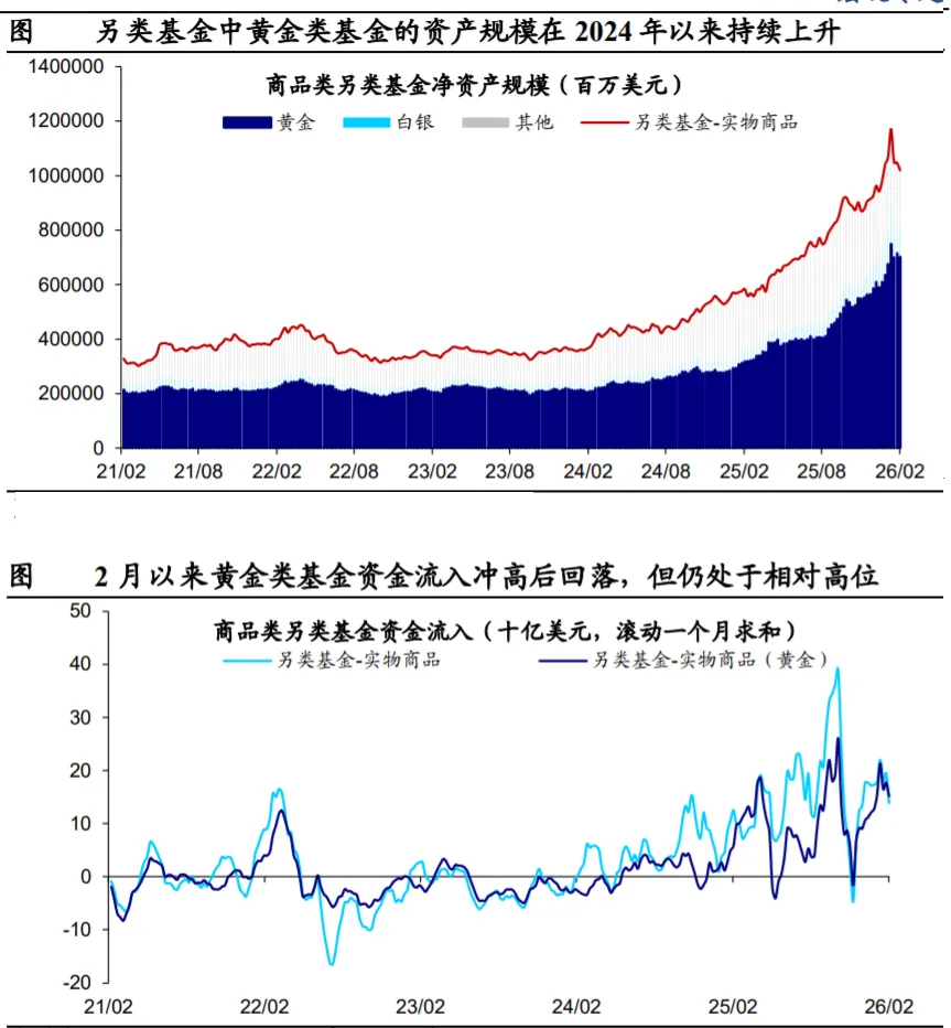 2025 年以来,私人部门黄金投资需求明显上 升,成为影响黄金价格更重要的定价因素。从 EPFR 中商品类另类 基金的数据来看,2025 年以来,以黄金为代表的商品类另类基金的 资产规模不断攀升,资金流入规模也呈现持续上升的趋势。未来来 看,在各国信任程度下降的情况下,全球仍在经历持续的货币体系 重构,同时地缘冲突扰动仍将存在,黄金长期的行情仍然会延续。