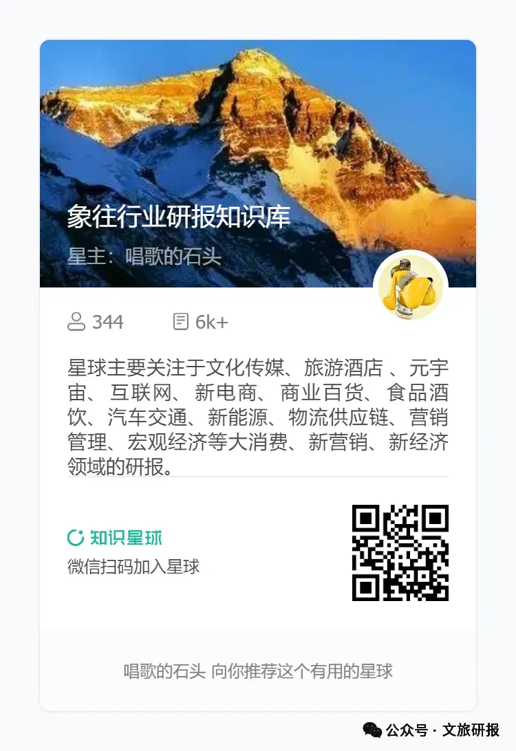 🔥 想更深度解锁?直接加入【知识星球】,一键获取:✔️ 4万+份各行业最新报告(金融/科技/消费/医疗等全覆盖)✔️ 每日更新30+篇,动态紧跟市场趋势✔️ 无需拼凑碎片信息,所有报告支持关键词搜索&即时下载📌 扫码加入星球(原价199/年,优惠券后98/年) 👇1. 文化旅游业