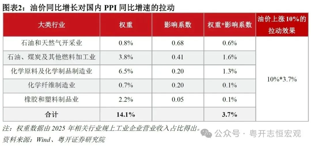 我们更多测算的是油价的直接冲击,PPI主要涉及成本端受影响较大的石油、化工行业,CPI主要是交通运输及燃气等。食品饮料、农副产品、替代能源(煤炭)等行业也会受到油价冲击,但由于影响路径复杂,难以准确合理估计其间接影响。