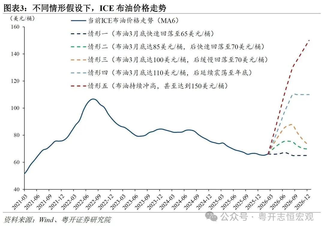 情形四:战事长期化,霍尔木兹海峡长期封锁,但周边产油国受波及较小。核心假设:布油价格中枢在3月底达110美元/桶,持续至年底。