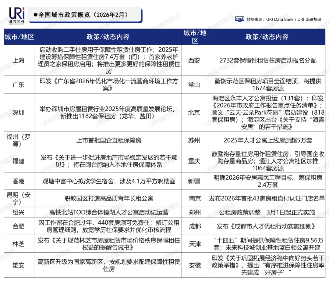 2月,全国多地住房租赁市场呈现供应提速与政策细化并行的态势。供应端,上海、北京、深圳、重庆等城市持续推出或筹建保障性租赁住房与人才公寓,苏州、天津等地披露“十四五”期间保租房建设成果。政策端,福建、安徽、北京海淀等地出台文件,明确将人才、台胞等群体纳入保障体系,并提出“好房子”建设导向;郑州、合肥等地优化公租房审核流程;林芝则加强租金市场秩序规范。此外,存量房收购、非居改租等模式持续推进,租赁住房市场正迈向精准化、品质化发展。