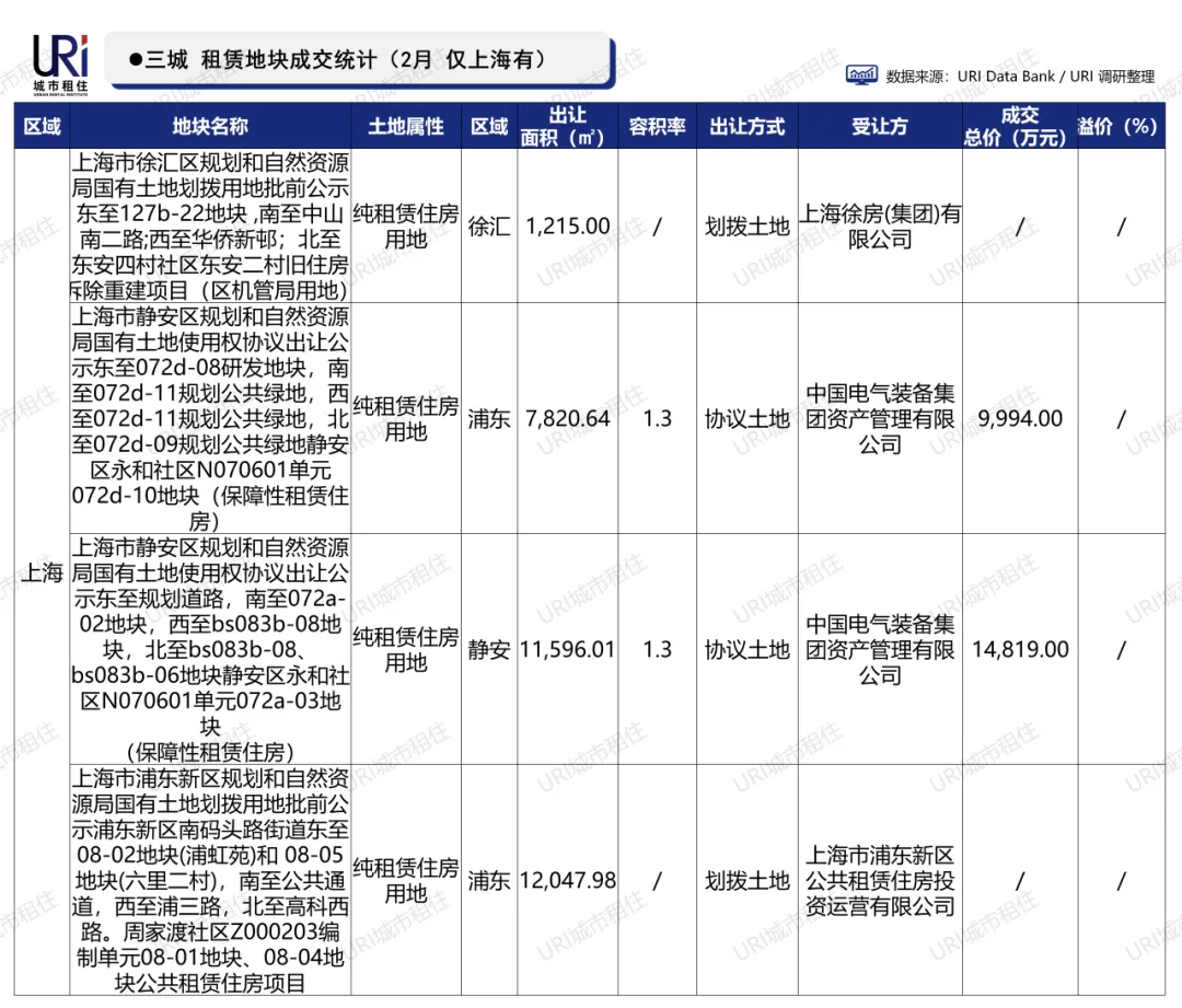 ■土地成交:租赁土地供应春节期间降温,仅上海成交4宗纯租赁地块