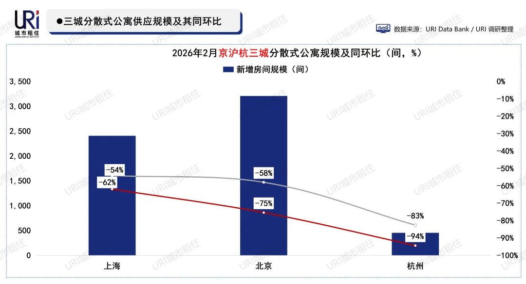 2月,受春节假期及市场调整影响,上海、北京、杭州三城分散式公寓新增挂牌房源全线暴跌。北京新增挂牌3209间、上海新增挂牌2408间,两城同环比跌幅超一半;而杭州新增挂牌仅455间,环比暴跌80%以上,近乎“断供”。