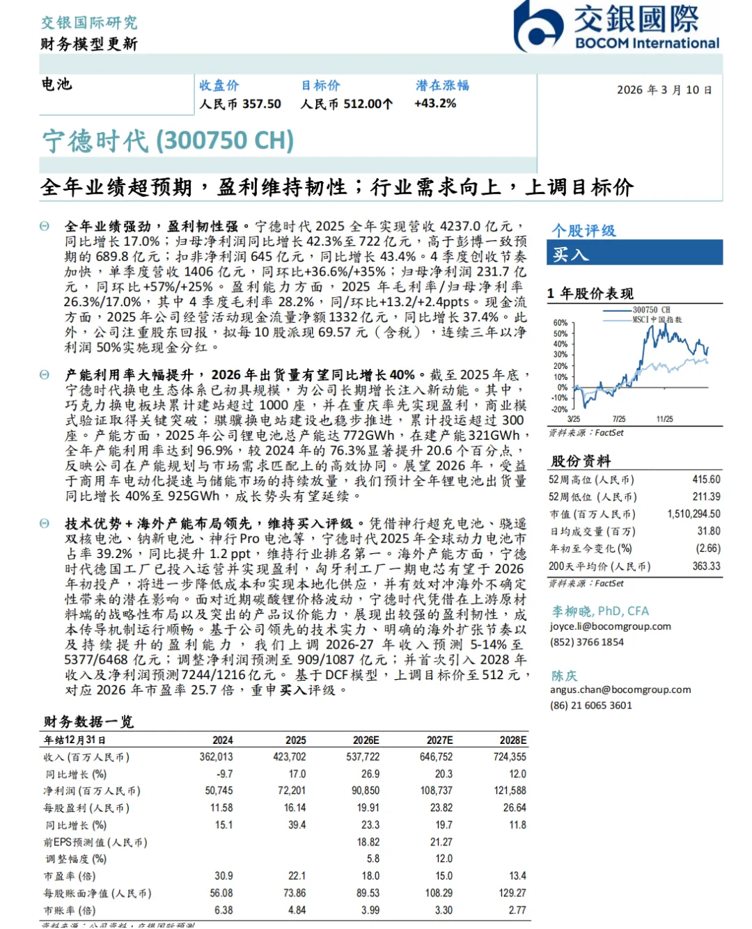 1.评级与目标价:基于DCF模型,上调目标价至512元,对应2026年市盈率25.7倍,当前收盘价357.50元,潜在涨幅43.2%,重申买入评级。