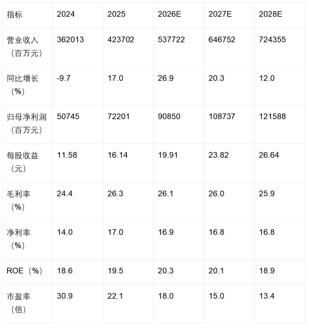 2.业绩预测调整:上调2026-27年收入预测5-14%至5377/6468亿元,调整净利润预测至909/1087亿元;首次引入2028年业绩预测,营收7244亿元、净利润1216亿元。