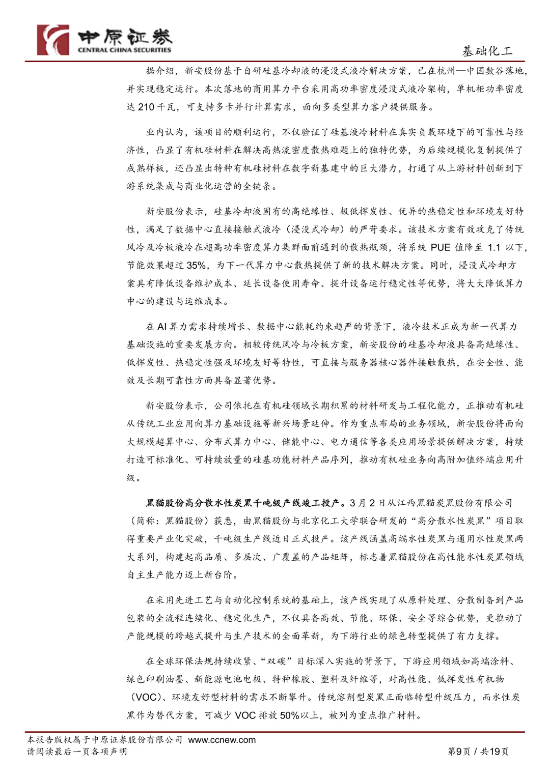 - 硅基冷却液用于数据中心浸没式冷却,目标把系统 PUE 降到 **1.1 以下**,节能 **超过 35%**。