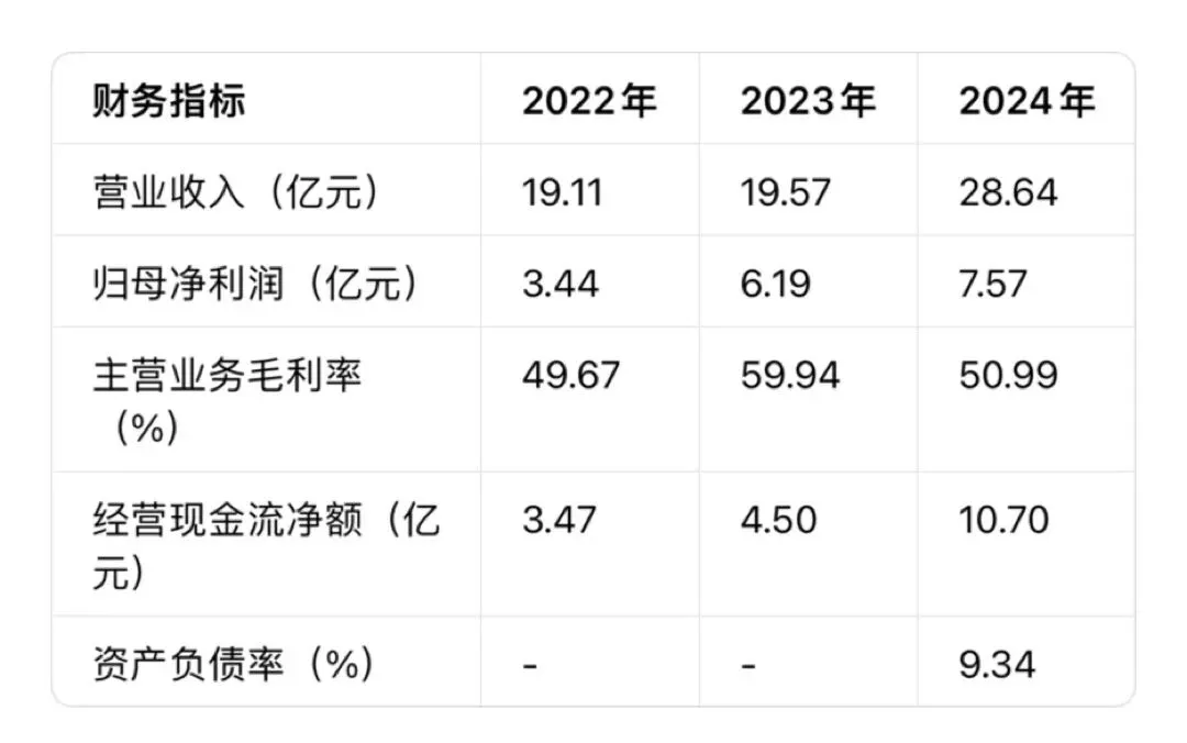 2022年至2024年,营业收入从19.11亿元增长至28.64亿元,复合增长率达22.42%;归母净利润从3.44亿元跃升至7.57亿元,复合增长率高达48.34%,盈利增速远超行业平均水平。