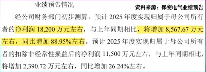 近期,保变电气公布业绩预告,预计2025年全年实现净利润1.82亿元,同比大增88.95%,创近十年新纪录。