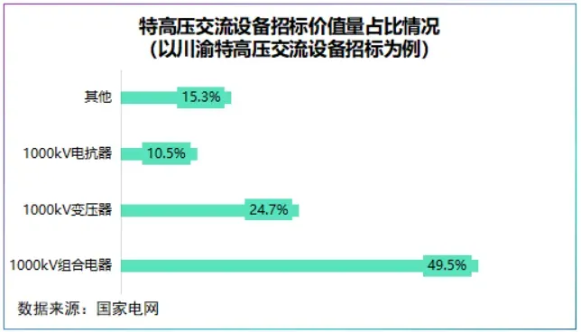 在特高压建设中,变压器是最核心设备,直流中1000kv变压器和1000kv组合电器招标价值量占比分别达到24.7%、49.5%。
