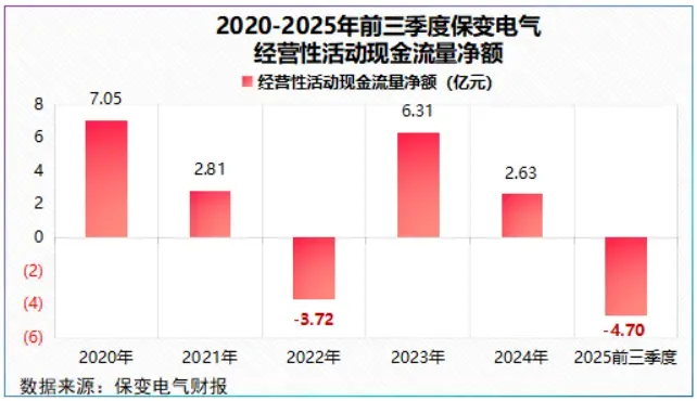 2025年前三季度,保变电气经营活动现金流量净额为-4.7亿元,甚至不及亏损的2023年。